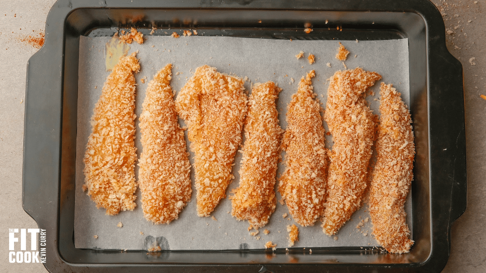 - Arrange the breaded tenders on the prepared baking sheet.
