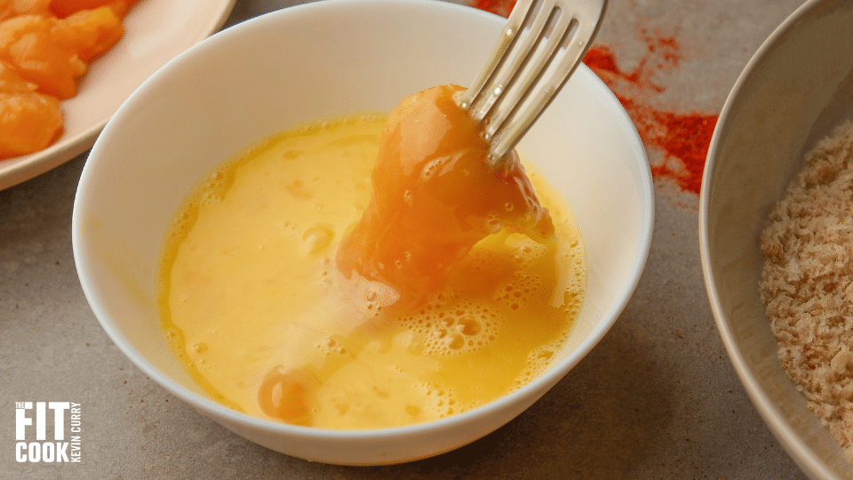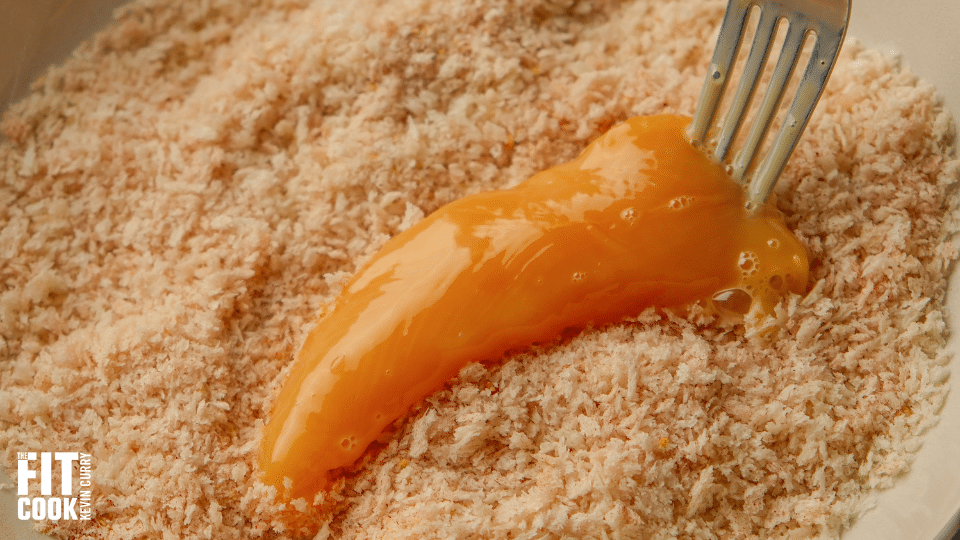 - Dip each chicken tender into the egg, then coat it with the seasoned panko, pressing gently to adhere.