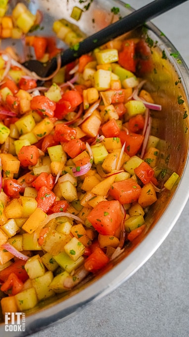 In a large mixing bowl, gently fold together the diced melons, sliced red onion, cilantro, and parsley. Pour the chili-lime dressing over the salad and toss everything together until the melons are evenly coated. Let the salad marinate for at least 2 hours in the fridge, or overnight for the best flavor.