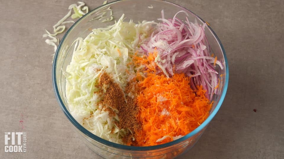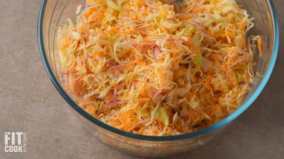 Combine cabbage (or a mix of green and purple), onion, carrot, sugar, and salt in a large bowl. Toss well. Let sit for 5-7 minutes.