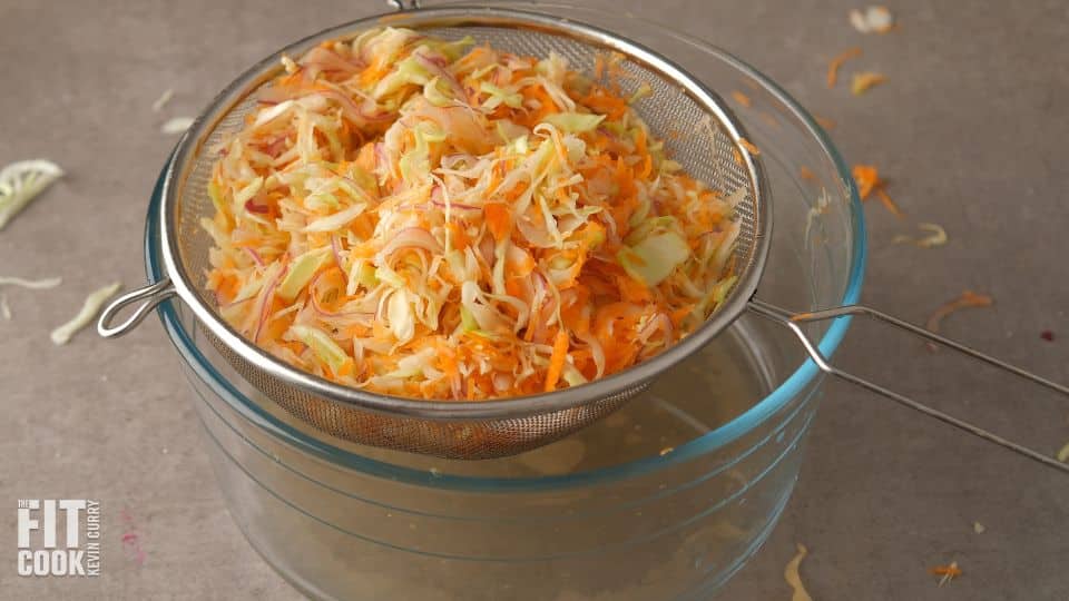 In a large bowl, combine the shredded cabbage, carrot, red onion, and kosher salt. Add sugar and toss everything together thoroughly. Let sit for 5–7 minutes—this draws out moisture and softens the vegetables slightly without losing crunch. After resting, rinse the mixture well under cold water using a colander. Drain thoroughly, then pat dry or spin dry in a salad spinner. Return the cabbage mix to a clean bowl.